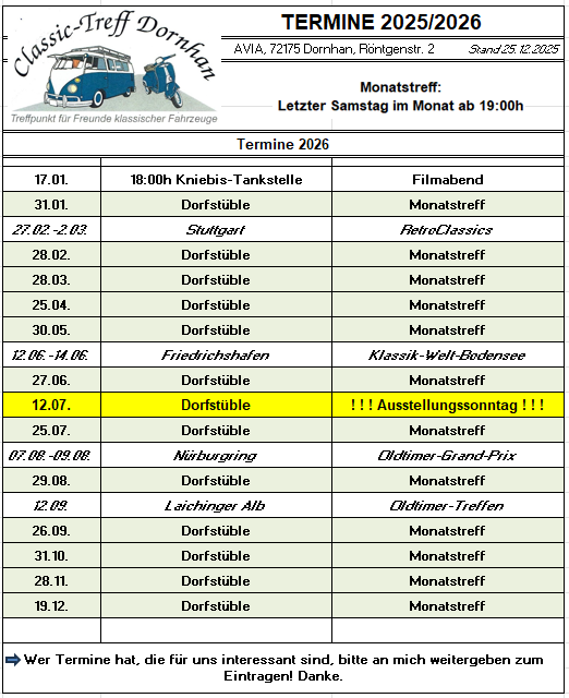 Der erste Termin 2026 ist - wie immer - nicht im Dorfstüble in Dornhan!